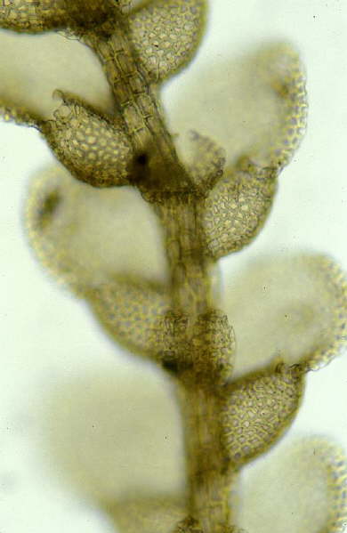 Lejeunea cochleata SpruceHabit, detail of underleaves and lobules, ventral view.Ecuador, Tunguragua, Spruce L 480, syntype (MANCH CC 18585)