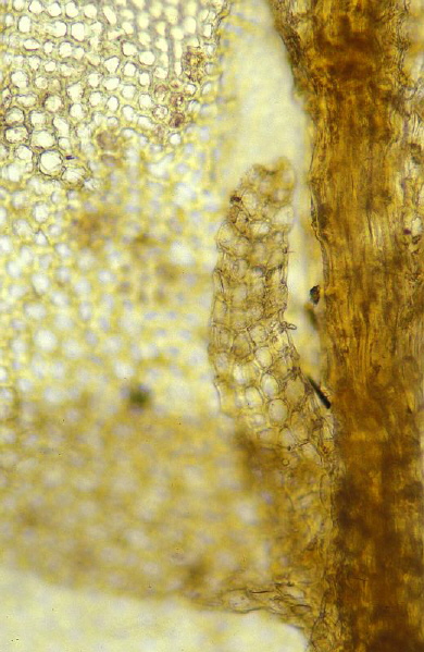 Lejeunea spiniloba Lindenb. & GottscheDetail of lobule.Mexico, Liebmann 143, lectotype (W [Lindenb. Hep. 6885])